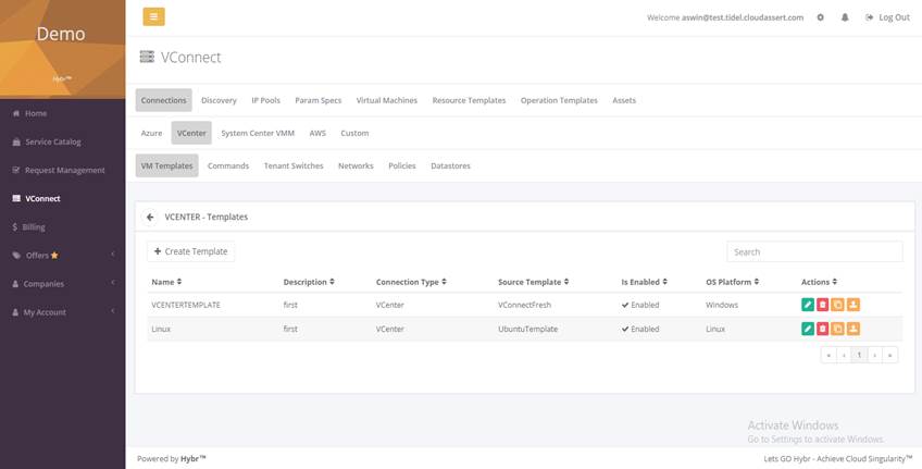 Hybr VConnect is a virtual machine integration and management solution. It is one of the core services available in Hybr. It integrates VMware vCenter and Microsoft System Center with Hybr and enables enterprises/cloud service providers to leverage investments across both public and private clouds.
