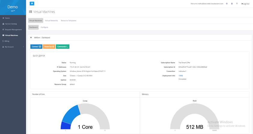 The Virtual machine dashboard displays the configuration and usage summary of the VMs.