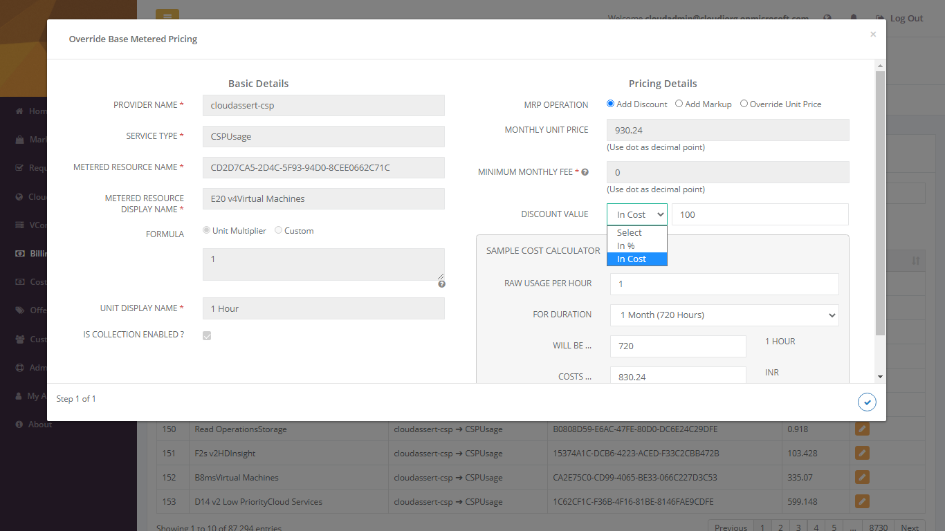 In the above image, Monthly Unite price is Rs. 930.24 and the discount value (in cost) is Rs. 100. Hence the discounted cost would be Rs. 830.24 as in the sample cost calculator.