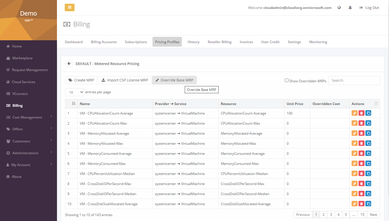 Billing → Pricing profile → Select child pricing profile → Override Base MRP → Select the required meter → Override Unite Price